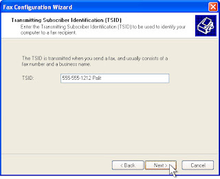 6,Type the "Transmitting Subscriber Identification (TSID)" that you want to use in the "TSID" box. Note The TSID is mandatory in some areas. This identification information typically appears in the header area of a fax that you receive. This information helps you identify the fax machine where the fax originates from. This information typically includes the sender's fax number and business name. then click "Next".
